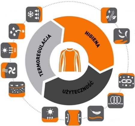 - Doskonałe parametry oddychające i oprowadzające wilgoć